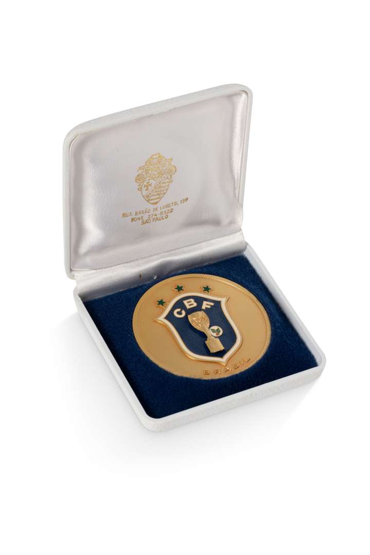 Médaille officielle de la fédération brésilienne de football avec les 3 étoiles et la Coupe du Monde Jules Rimet dans son écrin. Rare. Medal (6 cm) Brazil with three stars (three times World champion). Certificat d'authenticité (COA) sur demande.