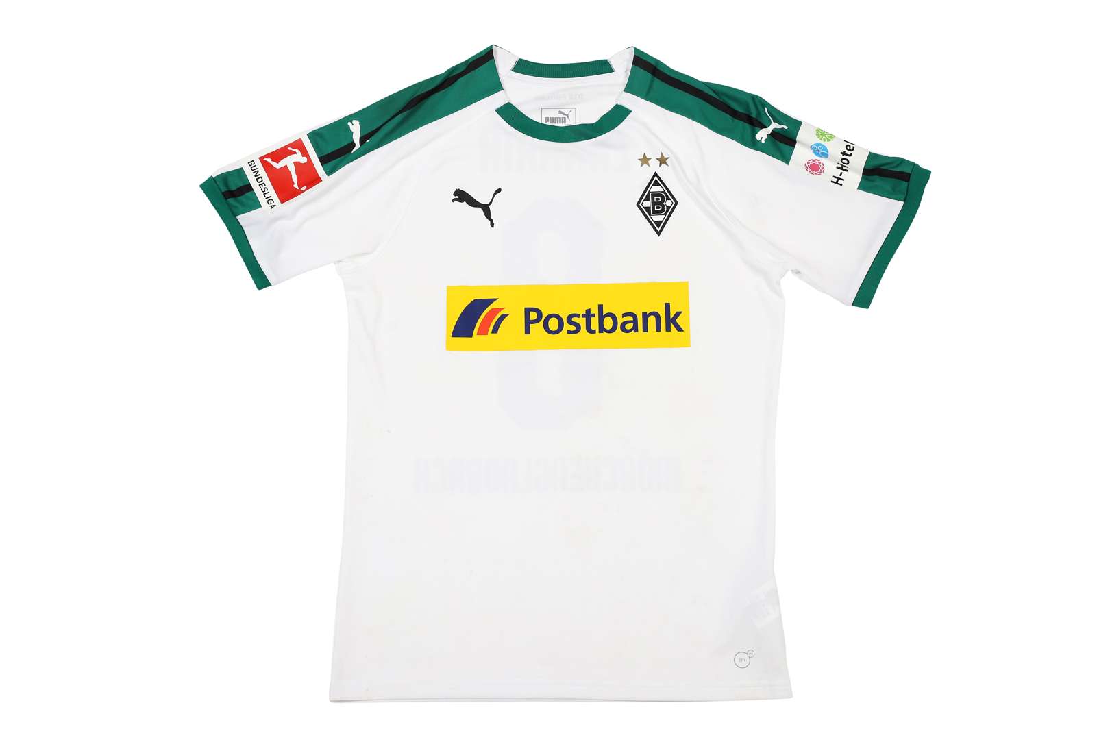 Maillot n°8 de Mönchengladbach porté lors de la saison 2018-2019 du Championnat d'Allemagne de Bundesliga contre Fribourg SC le 15 mars 2019. Le joueur joue 61 minutes. Marque Puma.