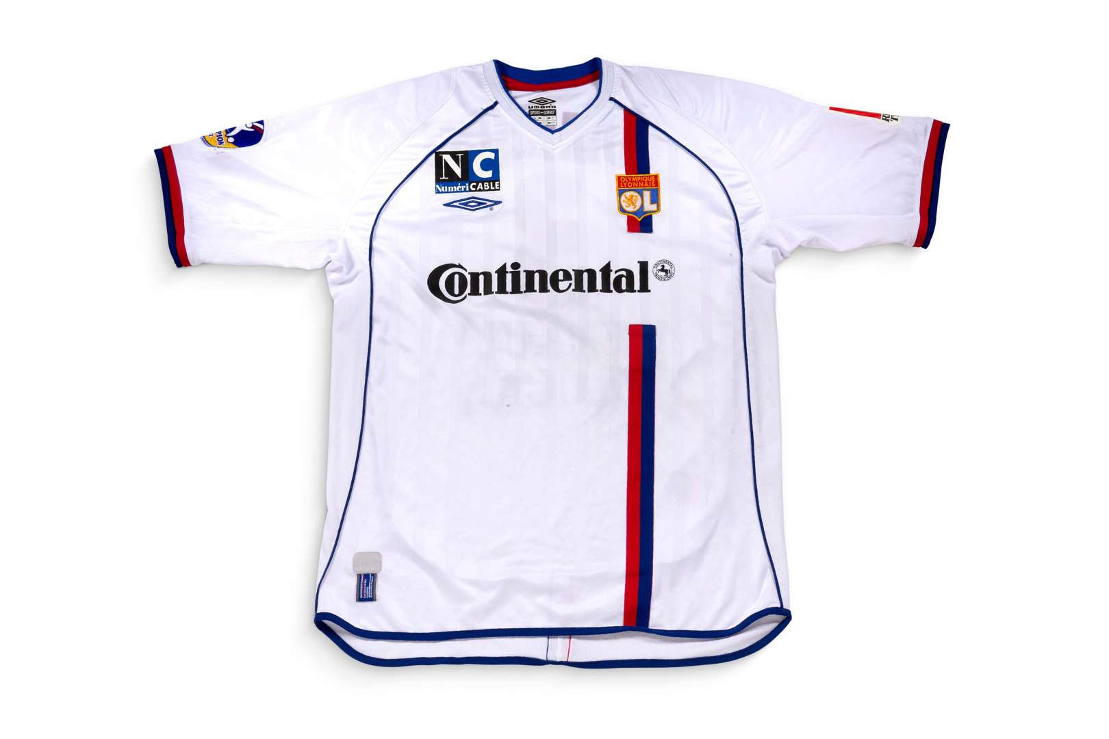 Maillot n°3 de l'Olympique Lyonnais préparé pour la saison 2002-2003 du championnat de France de Ligue 1. Match à déterminer. Le joueur joue 26 matchs. Marque Umbro. Modèle Vapa Tech. Taille XL. Certificat d'authenticité (COA) sur demande.