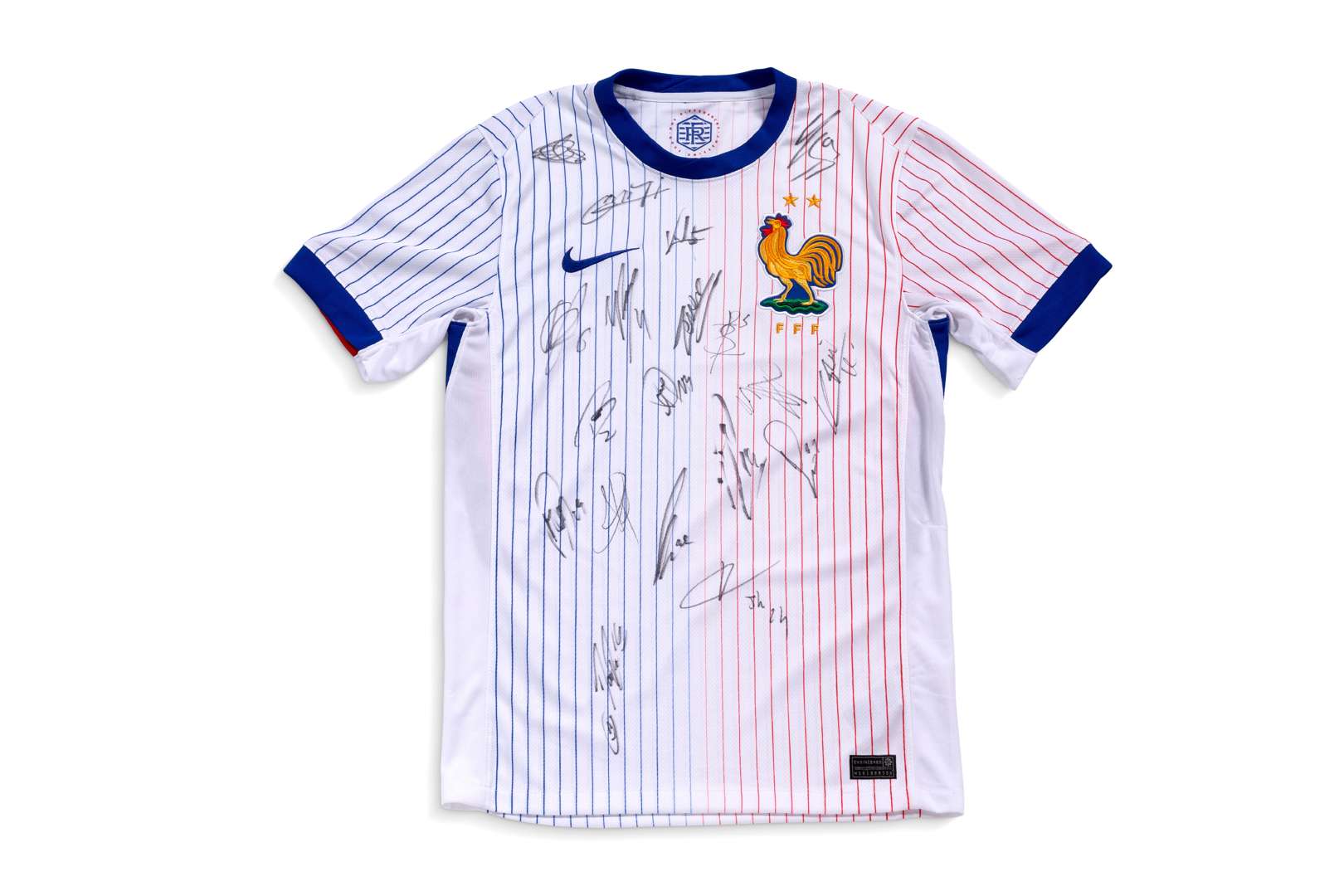 Maillot de l'équipe de France signé par les joueurs. Marque Nike 2024. Taille S. On y retrouve 19 signatures dont Ousmane Dembélé.