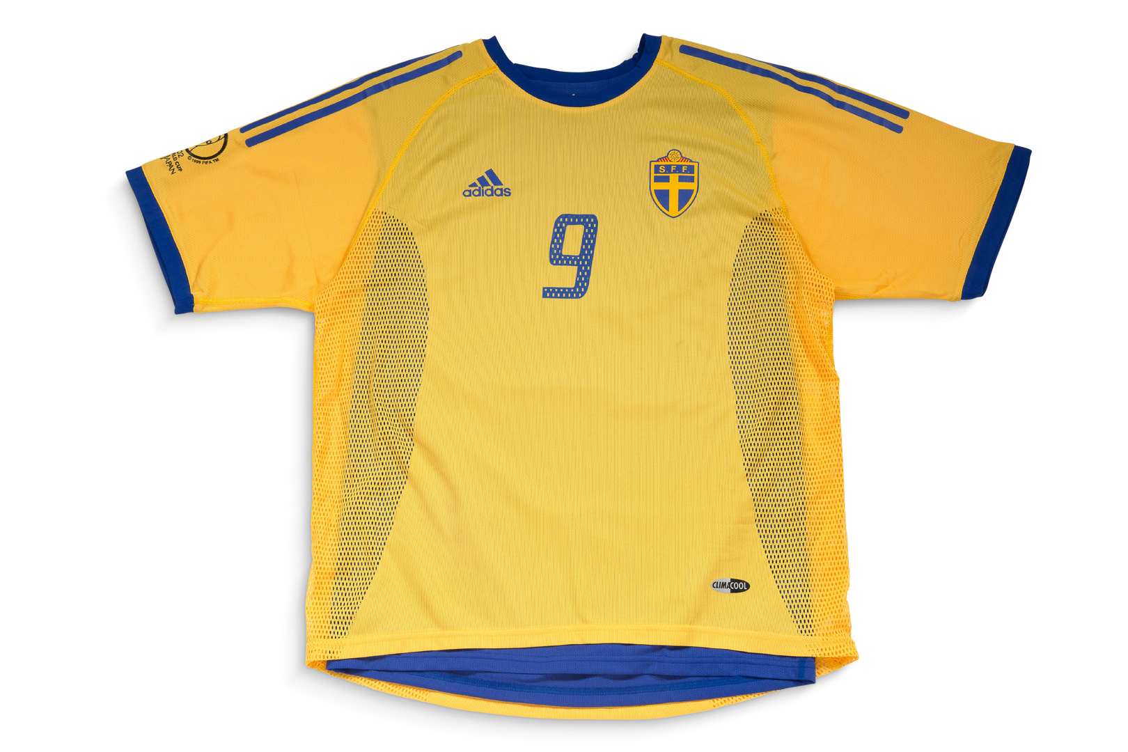 Maillot n°9 l'équipe de Suède préparé pour la Coupe du monde 2002 face à l'Argentine le 12 juin 2002. Le joueur joue les 2 rencontres. Marque Adidas. Modèle Climacool. Taille L. Certificat d'authenticité (COA) sur demande.