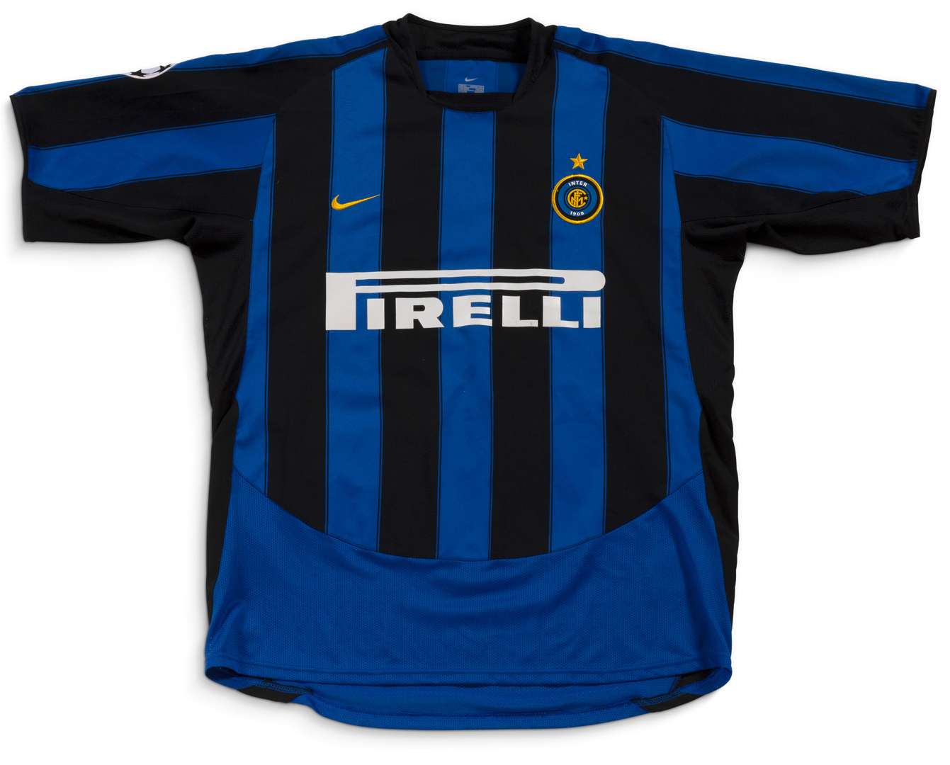 Maillot n°4 de l'Inter Milan préparé pour la saison 2003-2004 de Ligue des Champions. Match à déterminer. Le joueur joue 6 matchs. Marque Nike. Taille L. Fabriqué en Bulgarie. Certificat d'authenticité (COA) sur demande.
