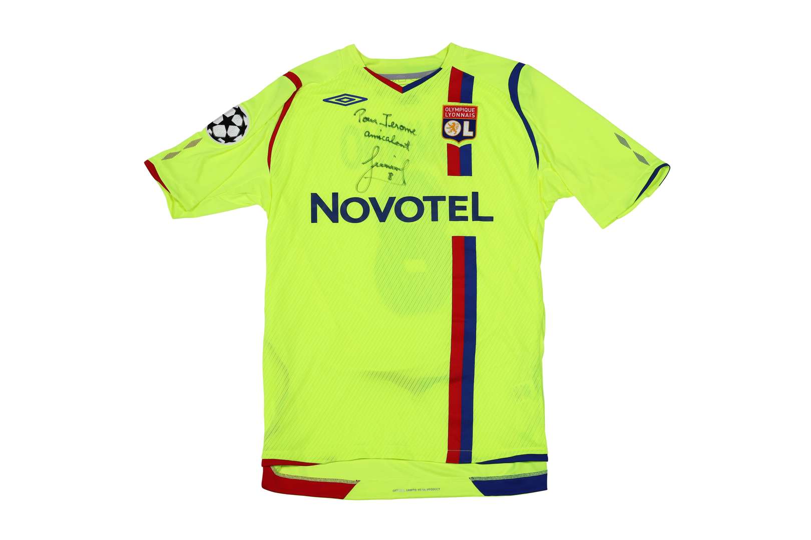Maillot n°8 de l'Olympique Lyonnais préparé pour la saison 2007-2008 de Ligue des Champions. Match à déterminer. Le joueur joue 8 matchs. Marque Umbro. Taille L. Certificat d'authenticité (COA) sur demande.