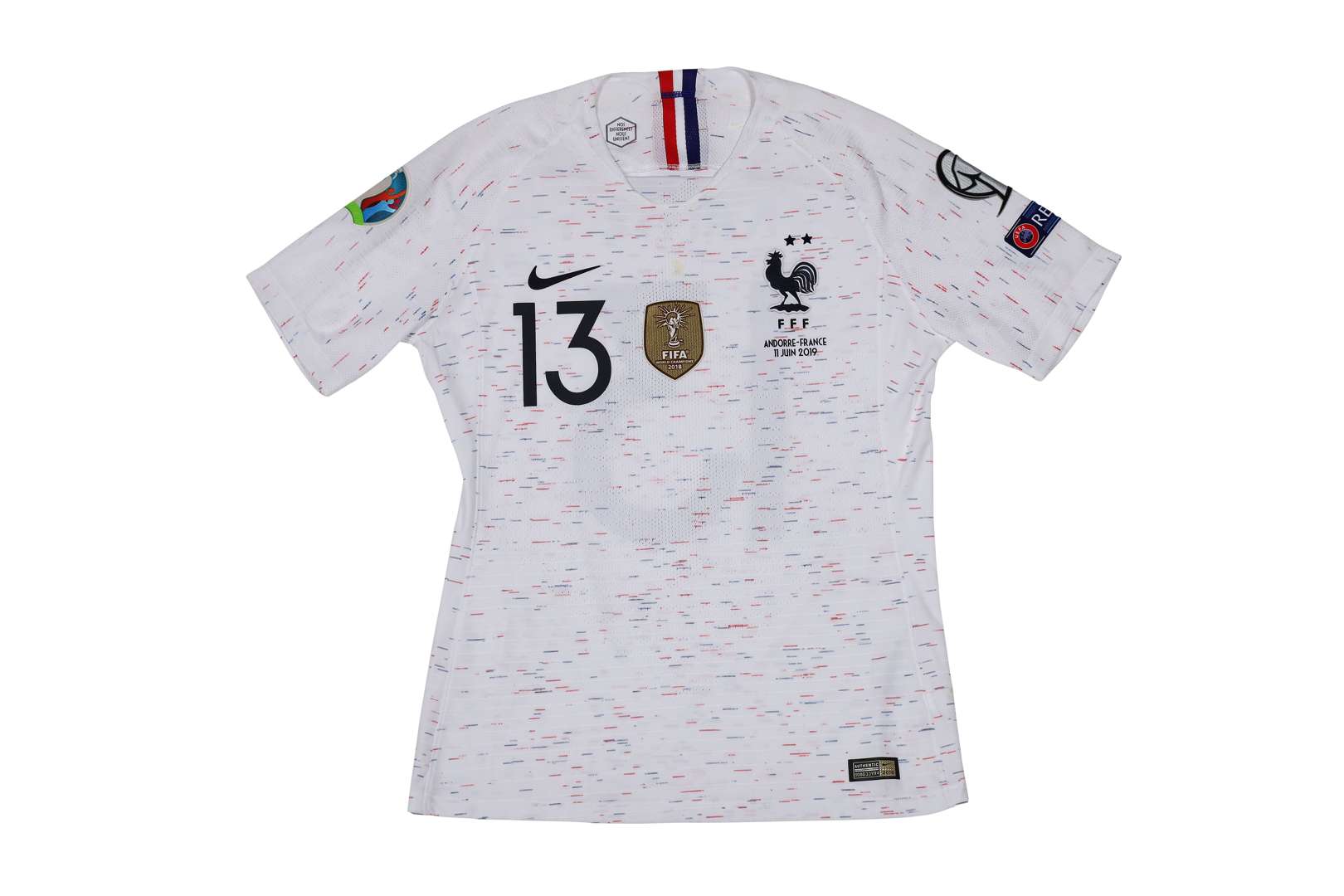 Maillot n°13 de l'équipe de France préparé pour le match des éliminatoires de l'Euro 2020 France - Andorre le 11 juin 2019 (4-0). Le joueur est forfait le 6 juin. Marque Nike. Taille M. Fabriqué en Thaïlande. Certificat d'authenticité (COA) sur demande.