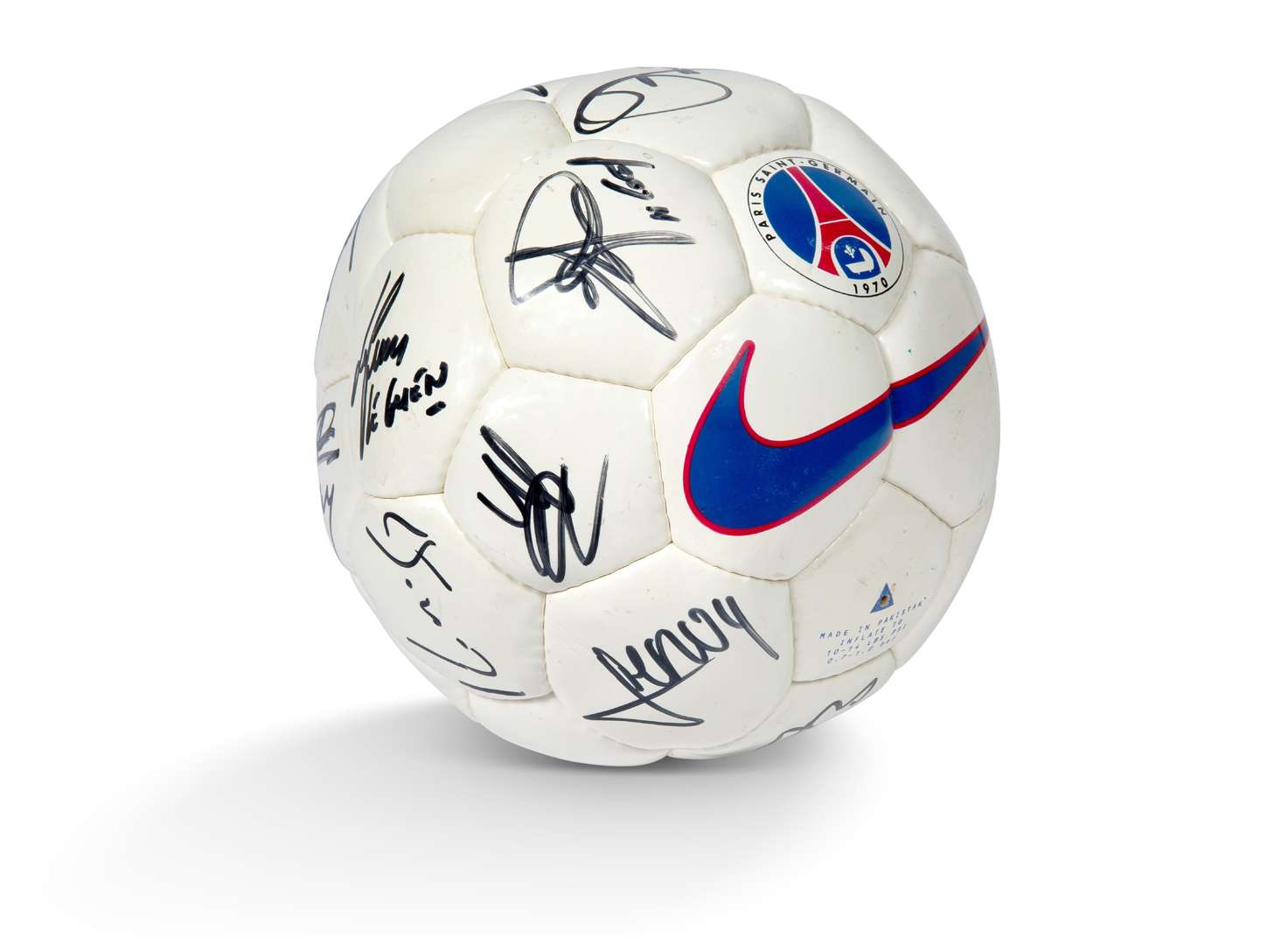 Rare ballon Nike signé du Paris-Saint-Germain signé par les joueurs saison 1997-98. On retrouve entre autres les signatures de Rai, Leonardo, Paul Le Guen, Bernard Lama, etc. Certificat d'authenticité (COA) sur demande.