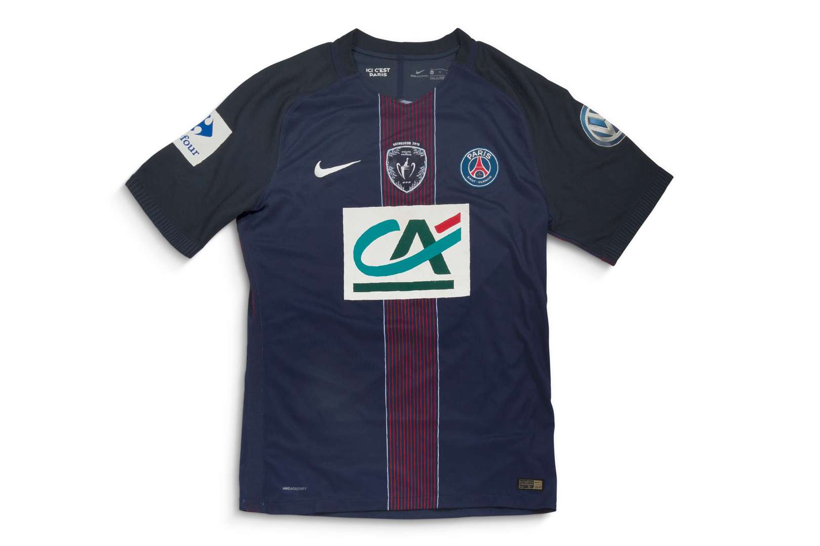 Maillot n°12 du Paris Saint-Germain porté lors d'un match de Coupe de France face à Monaco, saison 2016-2017. Marque Nike. Modèle Aeroswift. Taille XL.