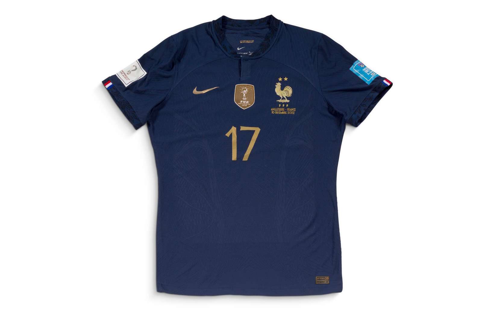 Maillot N°17 de l'équipe de France préparé pour le quart de finale de Coupe du Monde face à l'Angleterre le 10 décembre 2022. Le joueur est remplaçant. Marque Nike. Modèle Dri-Fit ADV. Taille XL. Fabriqué en Thaïlande. Certificat d'authenticité (COA) sur demande.