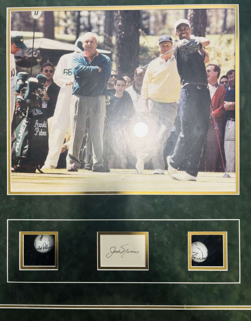 Encadrement composé d'une photographie de Tiger Woods, Arnold Palmer et Jack Nicklaus avec une balle de golf signée par Arnold Palmer, une balle de golf signée par Tiger Woods et un autographe de Jack Nicklaus. Certificat d'authenticité (COA) sur demande.