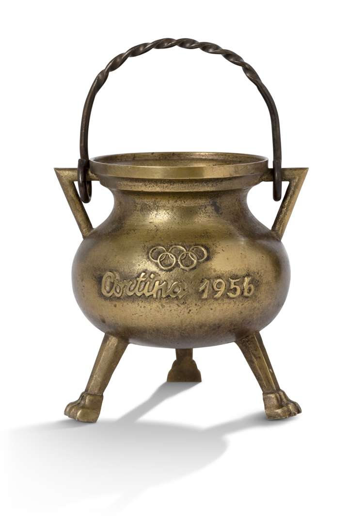 Trophée officiel du médaillé d'or des Jeux Olympiques d'hiver de Cortina 1956. Il s'agit d'un chaudron en bronze coulé à deux anses, reposant sur trois pieds à la manière d'un trépied grec antique. Inscription « CORTINA 1956 » surmontée des anneaux olympiques. Poignée de transport (hauteur : 14 cm sans la poignée). Le rapport officiel confirme que ces trophées, ornés d'edelweiss, étaient remis lors des cérémonies de remise des médailles. Les médaillés d'argent et de bronze recevaient des versions légèrement plus petites. Certificat d'authenticité (COA) sur demande.