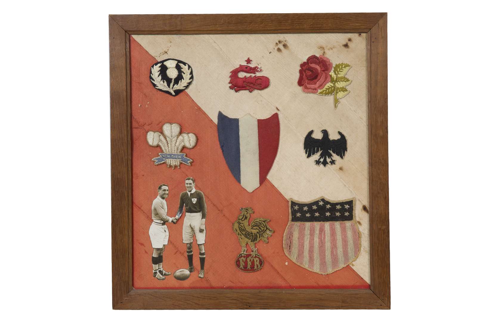 Cadre avec les fanions des anciennes équipes nationales. On retrouve le fanion de l'équipe de France, d'Allemagne, des Etats-Unis, de l'Angleterre, etc. Rare. Certificat d'authenticité (COA) sur demande.