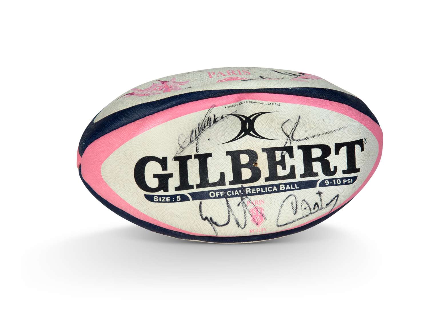 Ballon du Stade Français signé par les joueurs de l'équipe. Marque Gilbert. Certificat d'authenticité (COA) sur demande.