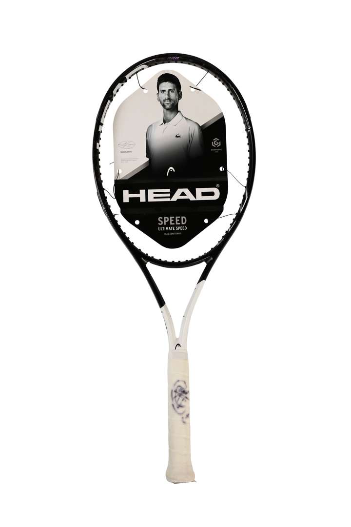 Raquette de tennis Head neuve signée à deux reprises par Novak Djokovic. Certificat d'authenticité (COA) sur demande.