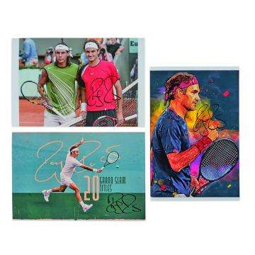 Lot de trois photographies signées par Roger Federer. Certificat d'authenticité (COA) sur demande.